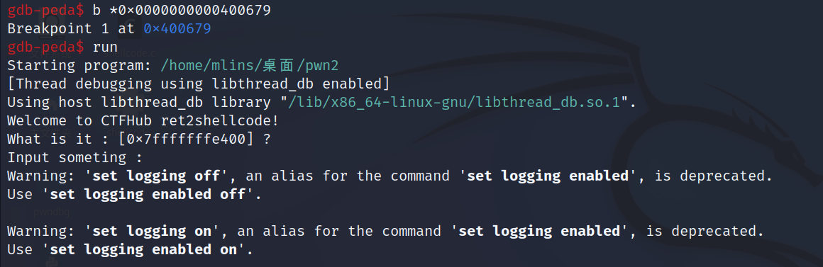 在read函数的上一句先打一个断点,并开始进行动态调试,可以看到程序输出一个一个地址为0x7fffffffe400